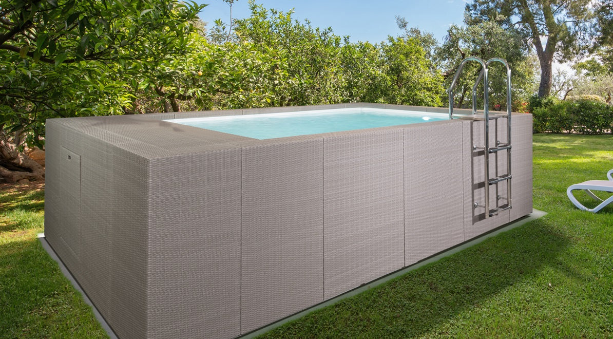 Das Modell Diva LTI ist eine durchdachte Erweiterung des beliebten Diva-Pools. Er verfügt über einen mit Rattan verkleideten Technikraum, der sich hinter dem Pool befindet.